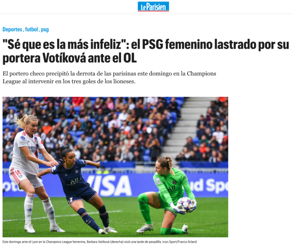 “Llegada el verano pasado al PSG procedente del Slavia Praga, Barbora Votíková había jugado primero de forma alterna con Stéphanie Labbé, antes de superar a la canadiensey luego aprovechar la jubilación anticipada de esta última.Bastante exitosa en lo que va de temporada, pese a un penalti encajado a principios de mesante el Paris FC (2-2), la seguidapor casi 500 mil suscriptores en su canal de YouTube no les mostrará,por el momento,el montaje de su actuación. Osimplemente de su reflejo decisivoen el pie,en una recuperación algo blanda de Ada Hegerberg en la prórroga (90+6′)”, rematan.