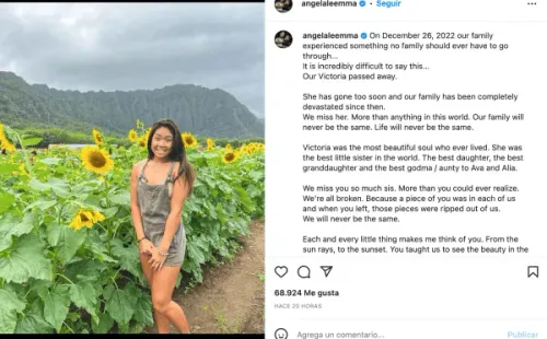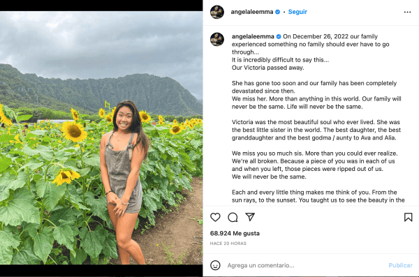 “El 26 de diciembre de 2022 nuestra familia vivió algo que ninguna familia debería pasar. Es increíblementedifícil de contar…Victoria ha fallecido. Se ha ido demasiado pronto y nuestra familia está completamente devastada desde entonces.La extrañamos, más que a nada en el mundo. Nuestra familia nunca será la misma. La vida nunca será la misma”, escribió.
