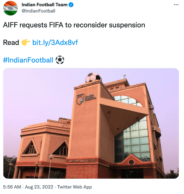 El 16 de agosto, la FIFA suspendió a la Federación India de Fútbol (AIFF) por injerencia indebida por parte de terceros, ya que la justicia india tomó decisiones respecto a la directiva de la federación. Eso implicaba que, mientras durasela suspensión, el país no podría recibir laCopa del Mundo Femenina sub 17, que sería en octubre.