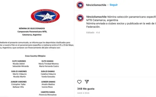 Dentro de la nómina de 13 deportistas que representarán a Chile en el Panamericano de Mountain Bike, que se desarrollará en Catamarca, Argentina, entre el 25 y 29 de mayo, la Federación de Ciclismo entregó los nombres de seis hombres y siete mujeres. Una de las dos que competirá en la categoría élite damas será María Fernanda Castro.
