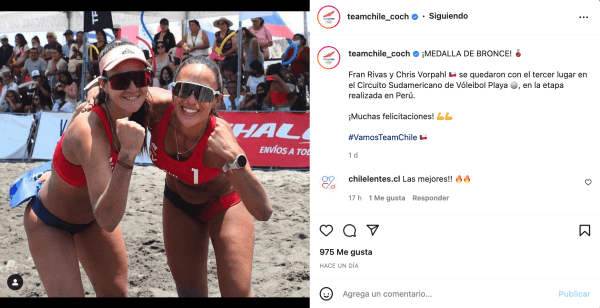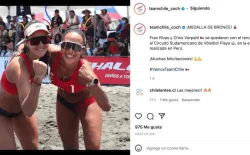 La dupla femenina de voley playa nacional, compuesta por Francisca Rivas y Chris Vorpahl, se quedó con el tercer lugar del circuito, luego de derrotarpor 21-10 y 21-15 a la pareja ecuatorianaKarelys Simisterra y Ariana Vilel, quienes se quedaron con el cuarto puesto y sin podio en esta jornada.
