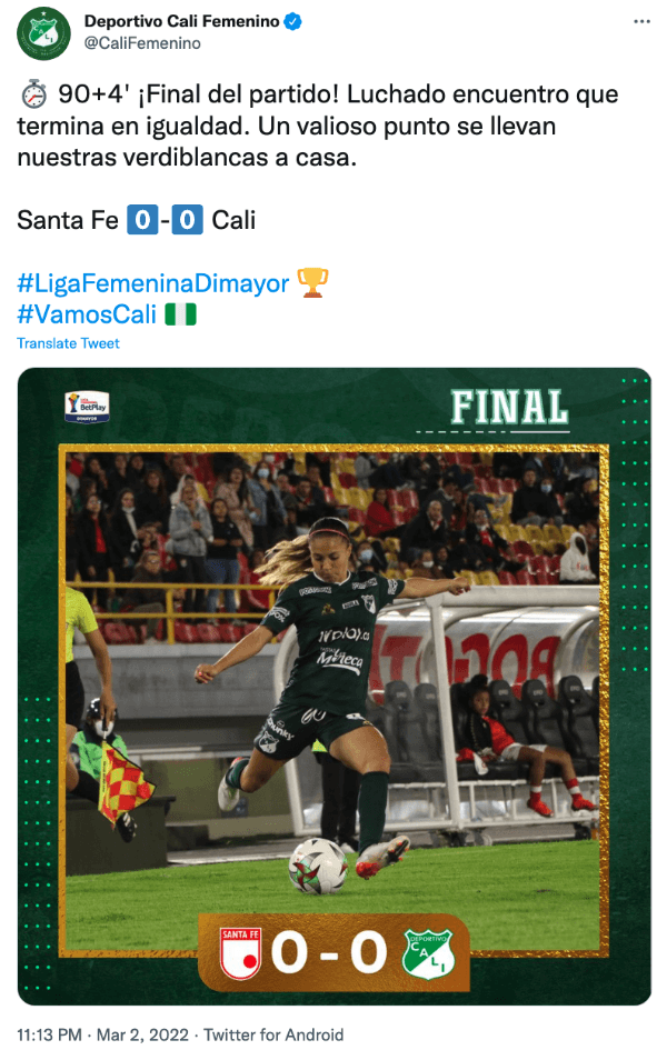 El encuentro terminó con un duro empate sin goles. El Cali la tuvo difícil para mantener el cero, razón por la que eligieron a la portera Franyely Rodríguez como la mejor jugadora del partido. Gisela Pino fue titular por segundo partido consecutivo,y estuvo en cancha durante los 90′. Stefany Castaño, otra vieja conocida del medio local, fue suplente.