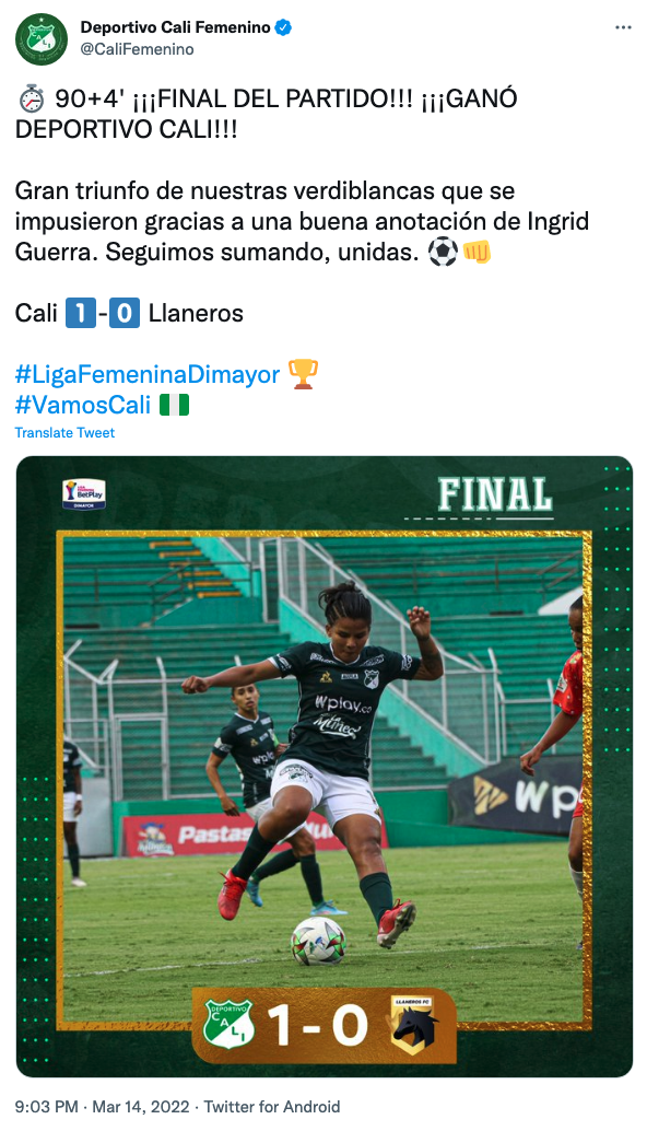 Ya en el partido, elúnico gol del Cali lo anotó su goleadora, Ingrid Guerra, a los 57 minutos. La delantera colombiana recibió un pase de Laura Orozco y definió con suavidad para poner el uno a cero parcial, que a la postre sería definitivo. La nacional sumó 90 minutos y volvió a las canchas, luego de jugar apenas 45′ en el juego pasado.