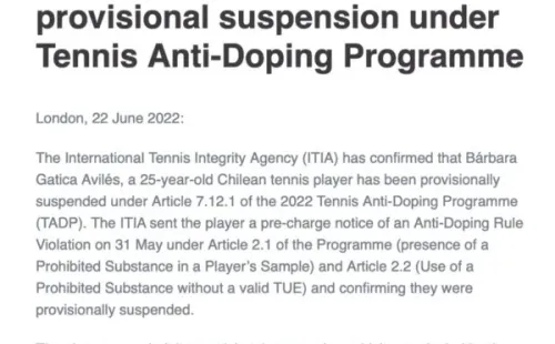 El comunicado asegura que”la ITIA envió a la jugadora un aviso previo a la acusación de una infracción de las normas antidopaje el 31 de mayo en virtud del Artículo 2.1 del Programa (presencia de una Sustancia Prohibida en la Muestra de un Jugador) y el Artículo 2.2 (Uso de una Sustancia Prohibida sin una AUT válida), confirmando su suspensión provisional”.