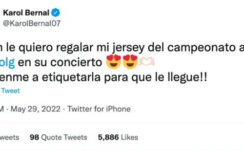 “Oigan le quiero regalar mi jersey del campeonato a @karolg en su concierto. Ayúdenme a etiquetarla para que le llegue!!”, escribió Bernal el día después que las Chivas fueron campeonas de la Liga MX Femenil, que contó con más de 600 RT y casi seis mil likes.