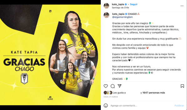 Kate aseguró que este año en Santiago Morning “sin duda fue una experiencia maravillosa y muy gratificante. Me despido con el corazón emocionado de todo lo que vivimos como familia y equipo. Espero haber defendido estos colores de la mejor forma posible y con todo el profesionalismo que siempre me ha caracterizado”.