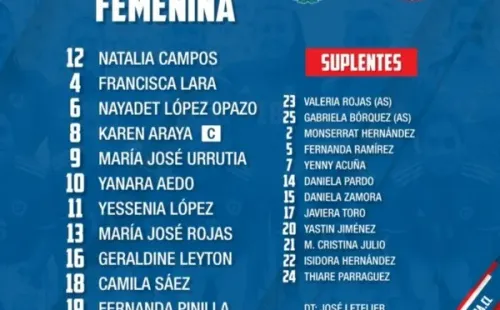 Por otra parte, la banca de suplentes estará compuesta por Gabriela Bórquez, Valeria Rojas, Fernanda Ramírez, Javiera Toro, Monserrat Hernández, María Cristina Julio, Yastin Jiménez, Daniela Pardo, Yenny Acuña, Isidora Hernández, Thiare Parraguez y Daniela Zamora.