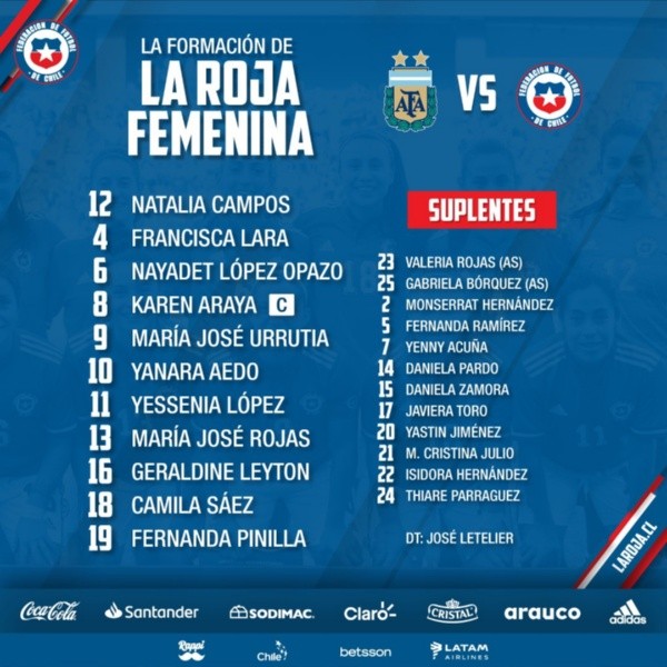 Por ese motivo, el once que paró José Letelier para enfrentar a las argentinas será con Natalia Campos; Geraldine Leyton, Nayadet López Opazo, Camila Sáez, Fernanda Pinilla; Yessenia López, Karen Araya, Francisca Lara; María José Rojas, María José Urrutia yYanara Aedo. Paloma vuelve a la titularidad.