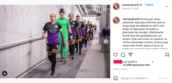 Además, Marta confirmó que se esforzará en la rehabilitación porque quiere volver a defender pronto la camiseta de Brasil. “Ahora es tiempo de enfocarme en mi recuperación para volver a hacer lo que más amo: representar a mi país, a mi gente y a mi equipo. Gracias a todos por su apoyo constante”, cerró.