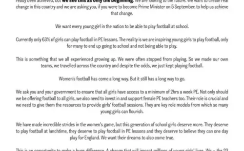 “A lo largo de la Eurocopa, nosotras, como equipo, hablamos de nuestro legado y de nuestro objetivo de inspirar a una nación. Muchos pensarán que esto ya se ha conseguido, pero nosotros consideramos que esto es sólo el principio. Miramos hacia el futuro. Queremos crear un cambio real en este país y le pedimos que, si llega a ser Primer Ministro el 5 de septiembre, nos ayude a conseguir ese cambio. Queremos que todas las niñas del país puedan jugar al fútbol en la escuela“, comienza la carta.
