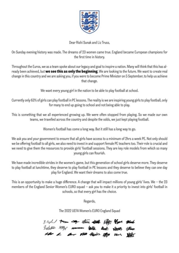 Este miércoles, las cuentas oficiales de la selección inglesa difundieron una carta firmada por las 23 jugadoras, que fue enviada a los dos candidatos a líder del Partido Conservador y Primer Ministro del Reino Unido,Rishi Sunak y Liz Truss, en las que solicitan una serie de mejoras en el accso al deporte para niñas y adolescentes en las escuelas en caso de ser electos el próximo 5 de septiembre.