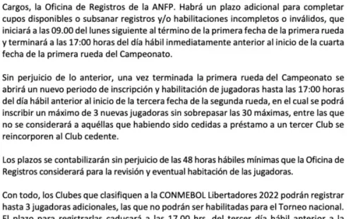 “Con todo, los Clubes que clasifiquen a la CONMEBOL Libertadores 2022 podrán registrar hasta 3 jugadoras adicionales, las que no podrán ser habilitadas para el Torneo nacional. El plazo para registrarlas caducará a las 17.00 hrs. del tercer día hábil anterior a la caducidad del plazo que CONMEBOL establezca para enviar los listados de buena fe para la competencia”, agrega el mismo artículo.