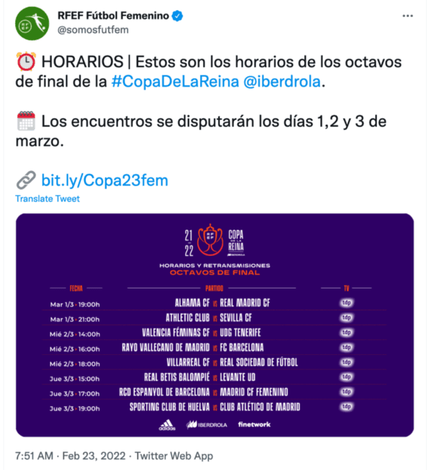 En caso de que alguna de las nacionales avance en la Copa de la Reina a la fase de cuartos de final, los partidos serán la semana del 16 y 17 de marzo, es decir, en dos semanas más. Serán programados una vez que se realice el sorteo.