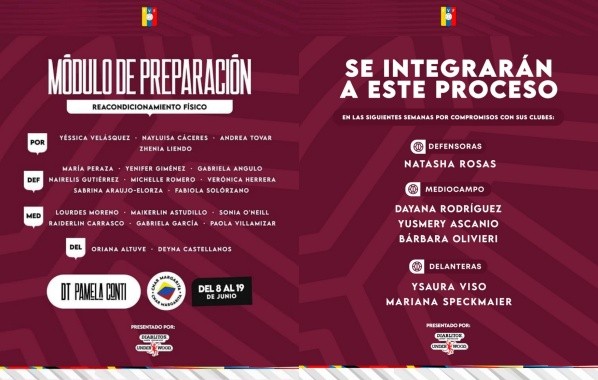 Por un lado, Ysaura Viso y Miku Ascanio, ambas de Colo Colo, recibieron el llamado de Pamela Conti y son citadas por la Vinotinto para los amistosos contra Chile del 25 y 28 de este mes. Ambas jugadoras, sin embargo, se sumarán a la concentración una vez que terminen sus compromisos con el Cacique.