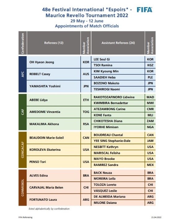 Las árbitrasque ya fueronnominadas para el Mundial y que también estarán en Francia sonNeuza Back (Brasil), Kathryn Nesbitt (USA) y Yoshimi Yamashita (Japón). Las otras tres convocadas (Karen Díaz Medina, Stephanie Frappart ySalina Mukansanga) no arbitrarán en el Maurice Revello.