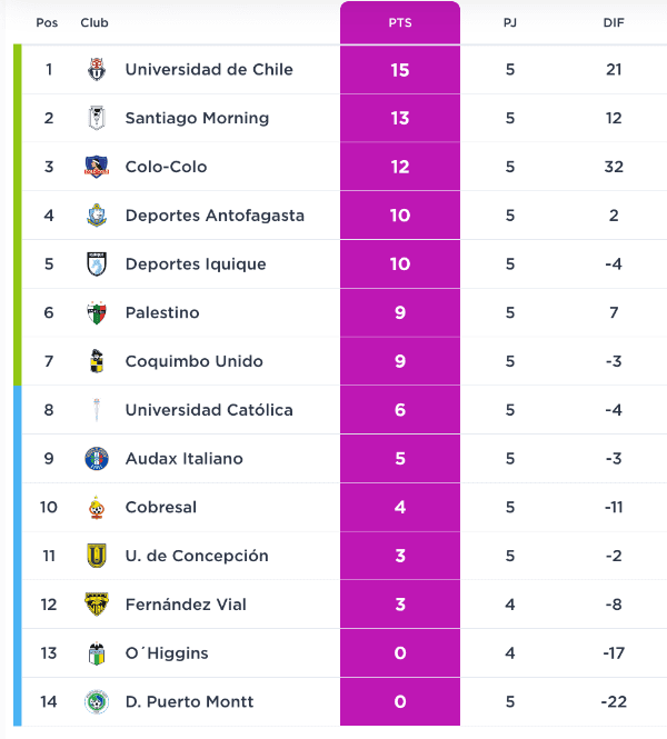Por otra parte, ya la zona baja la encabeza Universidad Católica que va 8vo con 6 puntos, seguido por Audax Italiano con 5 y Cobresal con 4 unidades. Universidad de Concepción y Fernández Vial se reparten los puestos 11ºy 12º con tres puntos, para dejar en el sótano a O’Higgins y Deportes Puerto Montt que no han sumado.