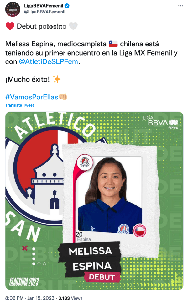 La Liga MX Femenil destacó el estreno de la nacional. “¡Debut potosino!Melissa Espina, mediocampista chilena está teniendo su primer encuentro en la Liga MX Femenil y con @AtletiDeSLPFem. ¡Mucho éxito! #VamosPorEllas”, escribieron en sus redes sociales.