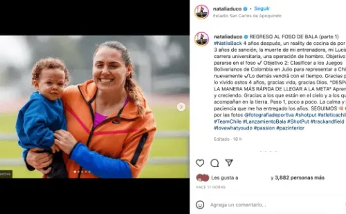 “REGRESO AL FOSO DE BALA (parte 1)#NatiIsBack4 años después, un reality de cocina de por medio, 3 años de sanción, la muerte de mi entrenadora, mi Luciano, una carrera universitaria, una operación de hombro. Objetivo 1: pararse en el foso.Objetivo 2: Clasificar a los Juegos Bolivarianos de Colombia en Julio para representar a Chile nuevamente. Lo demás vendrá con el tiempo”, comenzó Duco en su cuenta de Instagram.