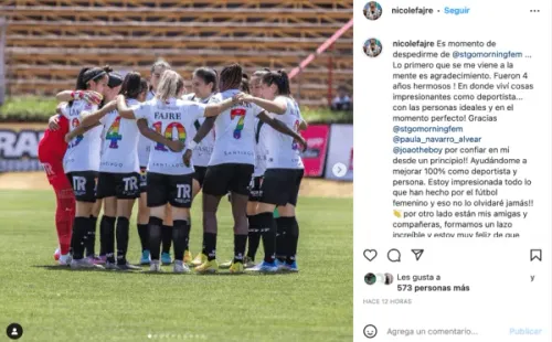 Se trata de Nicole Fajre, quien le dijo adiós al club al que llegó a principios de 2019, proveniente precisamente de la tienda azul. “Es momento de despedirme deSantiago Morning. Lo primero que se me viene a la mente es agradecimiento. Fueron 4 años hermosos, en donde viví cosas impresionantes como deportista… con las personas ideales y en el momento perfecto!”, expresó.