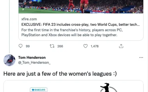 Tom Henderson, el periodista de XFire que informó sobre las novedades del FIFA 23, reveló que además de las cuatro ligas femeninas, también estará la Copa del Mundo Femenina Australia-Nueva Zelanda 2023 disponible en el videojuego, cuyo estreno mundial está programado paraseptiembre de este año.