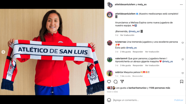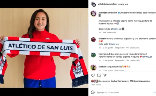 “¡Nuestro mediocampo está completo! Anunciamos a Melissa Espina como nueva jugadora de nuestro equipo. ¡Bienvenida!”, publicaron en sus redes, junto con imágenes de la firma de contrato de la chilena por su club.