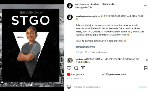 “¡TE RECIBIMOS CON ALEGRÍA FABI! Fabiana Vallejoses volante mixto, con harta experiencia internacional. Defendió la camiseta de Boca Juniors, River Plate, Everton, Cobreloa, Independiente Santa Fe y ahora trae todo su talento para defender a Stgo Morning”, expresaron en redes.