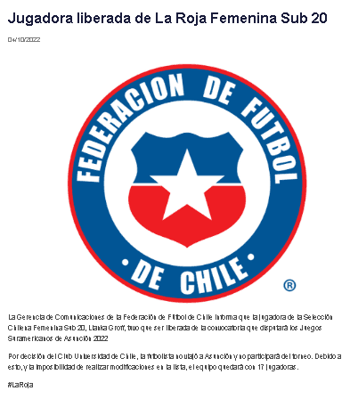 “La Gerencia de Comunicaciones de la Federación de Fútbol de Chile informa que la jugadora de la Selección Chilena Femenina Sub 20, Llanka Groff, tuvo que ser liberada de la convocatoria que disputará los Juegos Suramericanos de Asunción 2022”, informó un comunicado este martes, ya consumado el arribo del equipo a Paraguay.