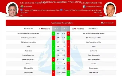 “Sandra Paños y Tiane Endlerson dos de las mejores guardametas del mundo en la actualidad y sus registros esta temporadas en la Champions son bastantes parejos, si bien la internacional española domina más el juego de manos y la chilena el de los pies”, destacando que la capitana tiene menos salidas (0.02) y menos duelos aéreos ganados (0.04).
