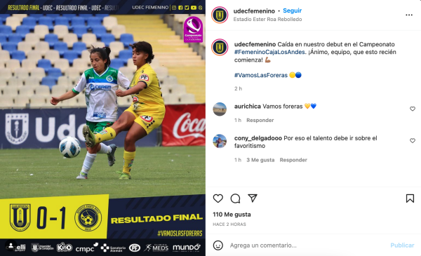 Por el lado del Almirante, Norma Castilla (22′) fue la encargada de abrir el marcador, pero la tarjeta roja que recibióBárbara Koster (43′) les puso el encuentro cuesta arriba en el segundo tiempo. Macarena Ávila (58′) empató las acciones y finalmente la UC no pudo desequilibrar fuerzas y terminó sumando de a un punto.