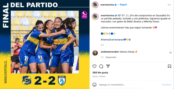 El marcador lo abrió Belén Bustos para Everton a los 2 minutos de partido, pero Deportes Iquique trató la remontada: con goles de Rocío Díaz a los 43′ y de Daniela Muñoz,por la vía penal, a los 47′, se pusieron en ventaja. Sin embargo, Milenka Pavez desde los 12 pasos marcó el 2-2 definitivo a los 84′.