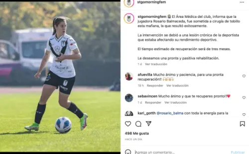 Así lo anunció el Chago. “El Área Médica del club, informa que la jugadora Rosario Balmaceda, fue sometida a cirugía de tobillo esta mañana, la que resultó exitosamente. La intervención se debió a una lesión crónica de la deportista que estaba afectando su rendimiento deportivo. El tiempo estimado de recuperación será de tres meses”, expresaron.