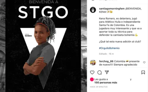 Se trata de la delantera colombiana Kena Romero, quien llega a Santiago Morning por lo que resta de 2022. La jugadora ya está en tierras nacionales y reportó en el entrenamiento bohemio este lunes por la mañana, para conocer a sus compañeras y comenzar a aclimatarse a Chile.