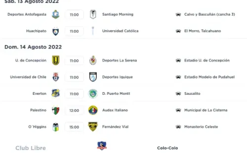 Por otro lado, el domingo habrá tres duelos a las 11:00 horas: U de Concepción vs Deportes La Serena, U de Chile vs Deportes Iquiquey Everton vs Deportes Puerto Montt. Además, a las 12:00 horas, jugarán Palestino con Audax Italianoy a las 15:00 O’Higgins frente aFernández Vial.