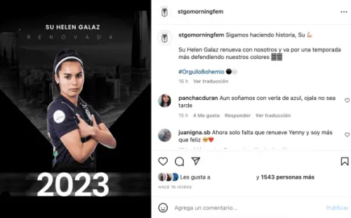 “Sigamos haciendo historia, Su! Su Helen Galaz renueva con nosotros y va por una temporada más defendiendo nuestros colores. #OrgulloBohemio”, escribieron en las redes sociales de Santiago Morning este lunes para anunciar su renovación.