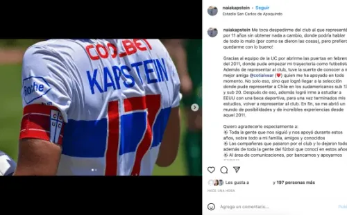 Las salidas de Universidad Católica para el Campeonato Femenino 2023 siguen causando coletazos. Este domingo, quien fuera su capitana durante todo 2022 y que lograse 11 años vistiendo sus colores,dijo adiós. Naiara Kapstein aprovechó sus redes sociales para confirmar que es la decimoquinta jugadora que se va de la UC.