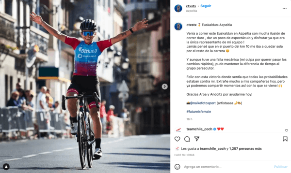 “Y aunque tuve una falla mecánica (mi culpa por querer pasar los cambios rápidos), pude mantener la diferencia de tiempo al grupo persecutor. Feliz con esta victoria donde sentía que todas las probabilidades estabancontra mí. Extrañe mucho a mis compañeras hoy, pero ya podremos compartir momentos así con lo que se viene!”, sentenció.