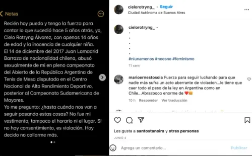 El 3 de junio pasado, Álvarez denunció a Lamadrid en su cuenta de Instagram. “Recién hoy puedo y tengo la fuerza para contar lo que sucedió hace 5 años atrás,con apenas 14 añosy con la inocencia de cualquier niña. Juan Lamadrid Barraza, de nacionalidad chilena, abusó sexualmente de mí en pleno Abierto de la República Argentina de Tenis de Mesa, posterior al Campeonato Sudamericano de Mayores. ¿Hasta cuándo nos van a seguir pasando estas cosas? No fue mi vestimenta, tampoco el horario ni el lugar.Si no hay consentimiento, es violación. Hoy decido no callarme más”, comenzó.