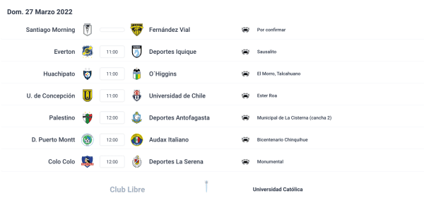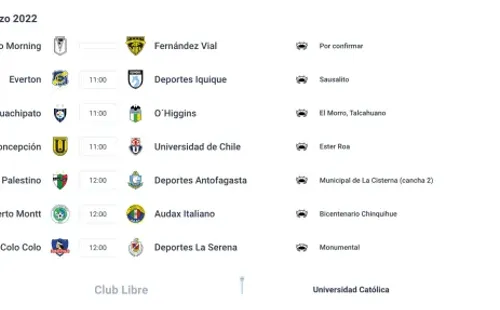 De momento, sin embargo, solamente seis han sido programados. Todos ellos se jugarán el domingo 27, conlas 11:00 y las 12:00 como hora de comienzo. El único encuentro que falta por definir cuándo se jugará es el de Santiago Morning vs Fernández Vial, cuya fecha y horario de inicio quedó “por confirmar”.