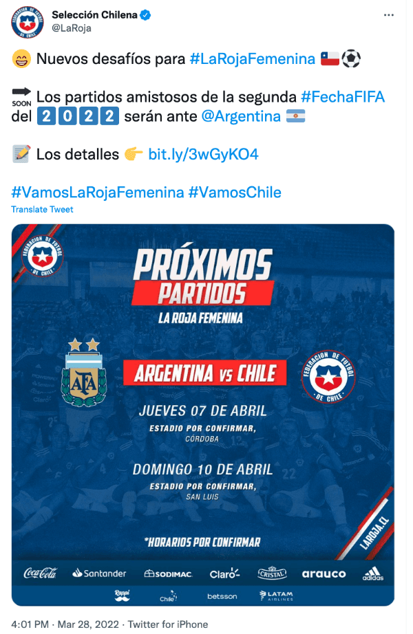 La AFA confirmó, este lunes, que durante la fecha FIFA femenina de abril próximo la selección chilena femenina enfrentará a Argentina en dos amistosos. ¿Dónde serán? En las ciudades transandinas de Córdoba y San Luis, el jueves 7 y el domingo 10, en estadios y horarios por confirmar.