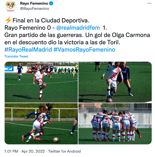 El Rayo Vallecano Femenino de las chilenas sentenció su descenso en la Primera Iberdrola de España el pasado fin de semana, cuando cayó por 4-3 a manos del Levante por la fecha 27 del torneo. Han sumado apenas 11 puntos en la temporada 2021/22: dos triunfos, cinco empates y 20 derrotas.