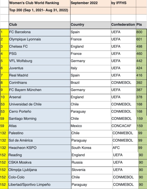 Palestino y Colo Colo cierran el ranking chileno. Las árabes están en el 132º con 99 puntos, empatadas con Sol de América (Paraguay) yHwacheon KSPO (Corea del Sur). Las albas, en tanto, son las 152º, igualadas con elCSKA Moscú (Rusia),Olimpija Ljubljana (Eslovenia), Reading (Inglaterra) yLibertad-Limpeño (Paraguay), con 90 unidades.