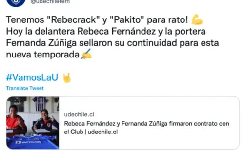 Rebecrack, por su parte, fue una de las principales asistidoras de la temporada 2021 para la U, que terminó con el equipo como campeón del torneo Femenino, luego de vencer la hegemonía de Santiago Morning en la gran final, por dos goles a uno. “Surapidez y agilidadnos acompañará un nuevo año paracumplir todos los objetivosen el plano nacional e internacional”, señalaron desde el CDA.