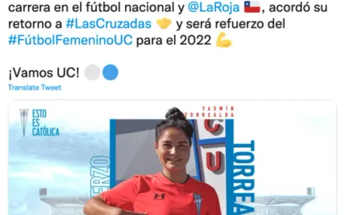 “¡Bienvenida, Yaz! Yazmín Torrealba, experimentada delantera, con larga carrera en el fútbol nacional y La Roja, acordó su retorno a Las Cruzadas y será refuerzo del Fútbol Femenino UC para el 2022″, señalaron en las redes sociales de Cruzados.