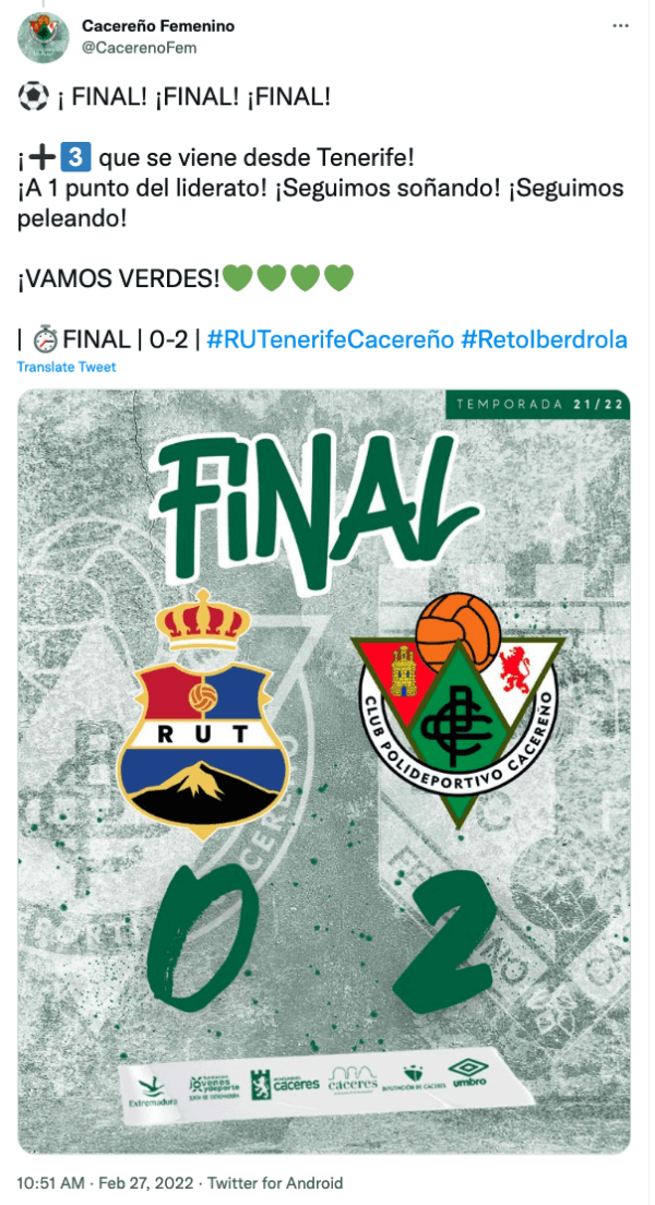 Bárbara Santibáñez fue titular y jugó los 90′ en la victoria del Cacereño Femenino sobre el Real Unión de Tenerife Tacuense. El marcador fue dos a cero para las verdes, que se ubicaron segundas en la tabla del Grupo Sur con 33 puntos, a uno de las líderes (Alhama CF, 34 ptos). Esta vez, la chilena no fue autora de los goles.