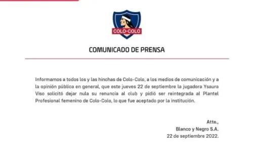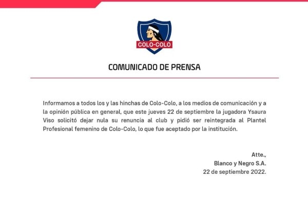 Durante la tarde, desde Colo Colo confirmaron la permanencia de Ysaura Viso explicando que la goleadora venezolana del equipo femenino del Cacique pidió anular su renuncia para continuar como delantera de las albas.