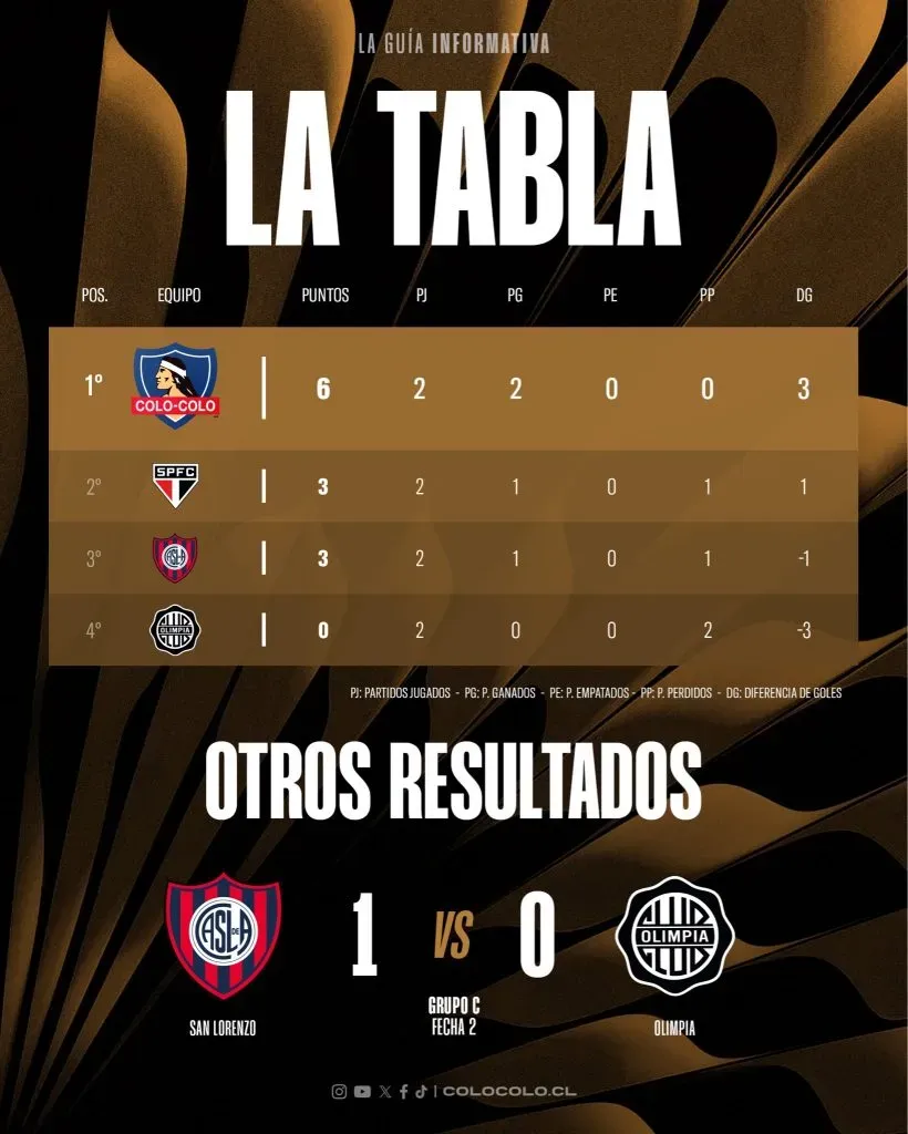Con canasta completa y nueve puntos en el primer lugar del Grupo C, Colo Colo enfrentará en cuartos de final a Libertad de Paraguay, que clasificó segunda en el Grupo D de la eliminada Universidad de Chile. El invicto hace mucho tiempo Colo Colo (9 puntos) avanza junto a Sao Paulo (6). Eliminados quedan San Lorenzo (3) y Olimpia (0).