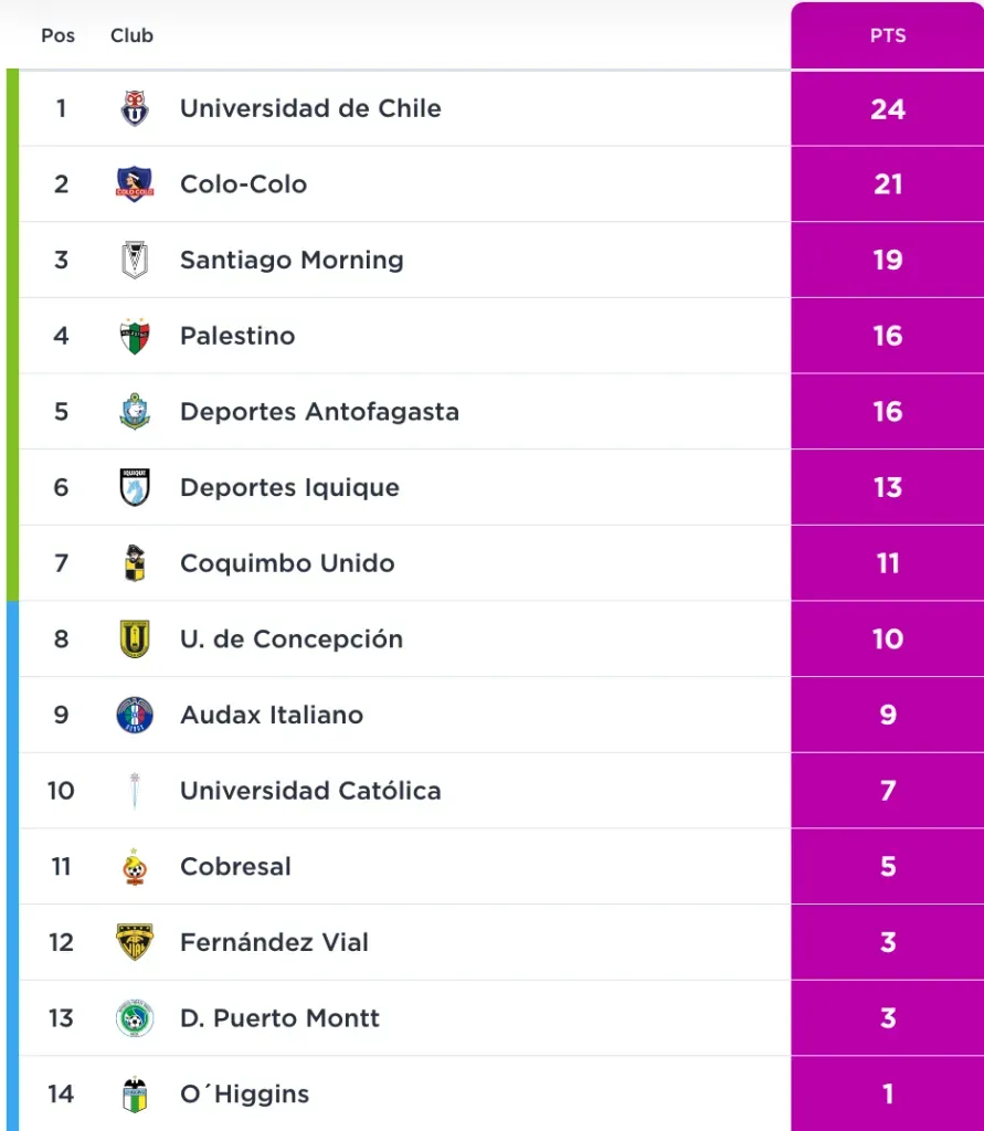 Las primeros cuatro posiciones siguen intactas. Universidad de Chile mantiene su invicto y 100% de rendimiento, suma 24 unidades y están punteras. Segundo le sigue Colo Colo, con 21 puntos, y tercero se instaló Santiago Morning, con 19. En el cuarto y quinto puestos están empatadas Palestino y Deportes Antofagasta (+16 y +7).