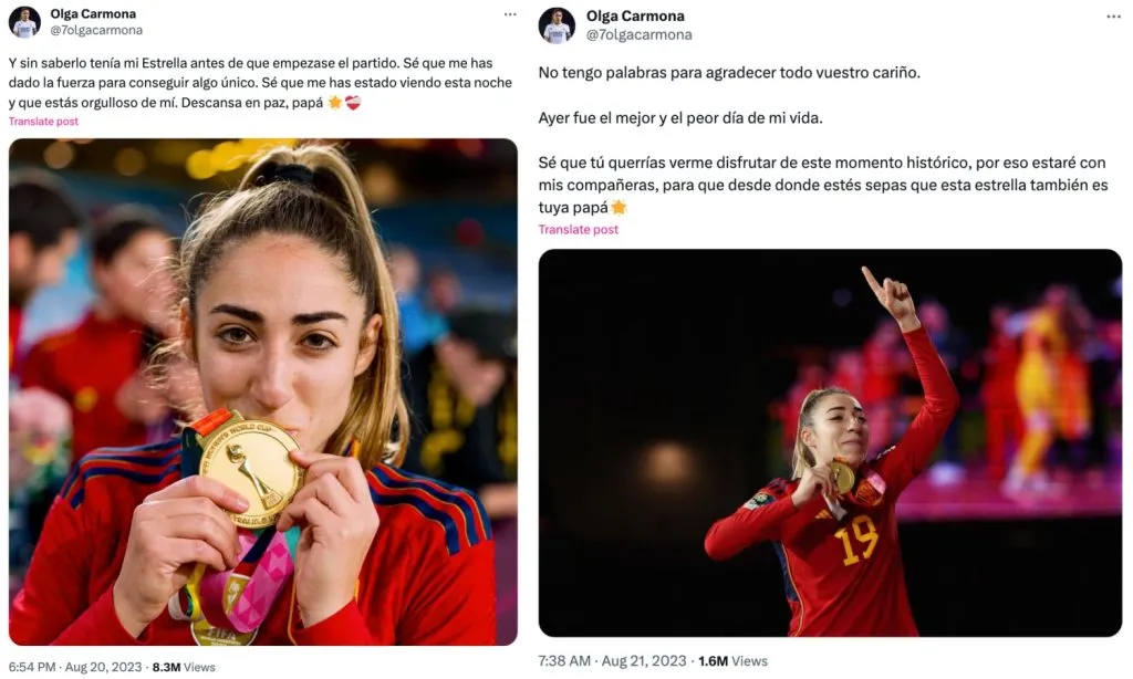 Así lo informó la Real Federación de Fútbol Español. “La RFEF lamenta profundamente comunicar el fallecimiento del padre de Olga Carmona. La futbolista ha conocido la triste noticia una vez concluida la final de la Copa del Mundo. Mandamos nuestro abrazo más sincero a Olga y a su familia en un momento de profundo dolor. Te queremos, Olga, eres historia del fútbol español”.