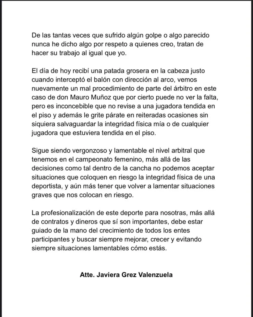 “El día de hoy recibí una patada grosera en la cabeza justo cuando intercepto el balón con dirección al arco. Vemos nuevamente un mal procedimiento del árbitro. en este caso, don Mauro Muñoz. Que, por cierto, puede no ver la falta, pero es inconcebible que no revise a una jugadora tendida en el piso y además le grite ‘párate’ en reiteradas ocasiones sin siquiera salvaguardar la integridad física mía o de cualquier jugadora que estuviera tendida en el piso”, destaca.