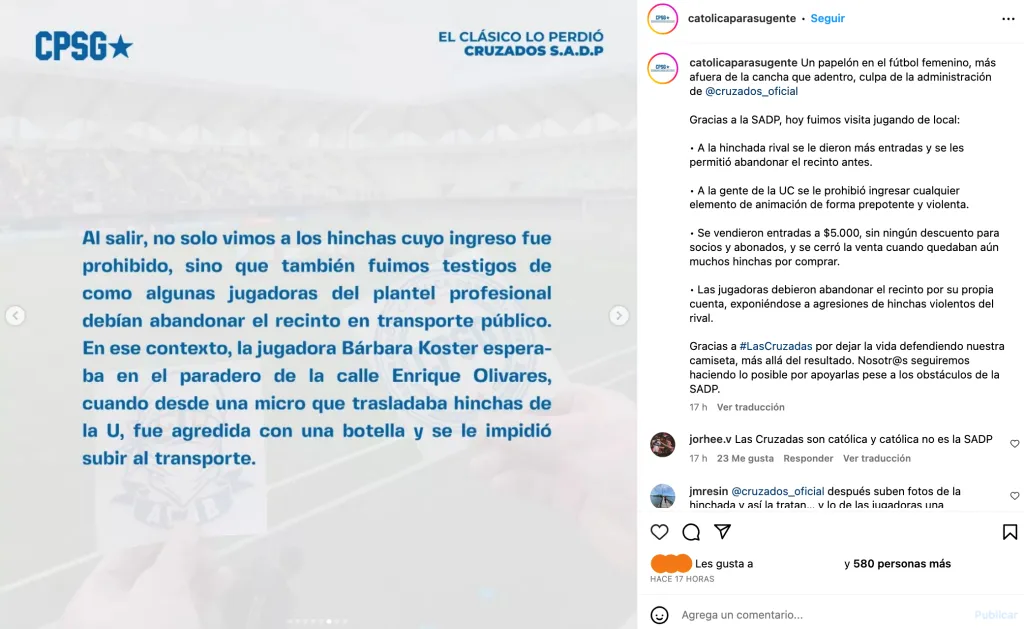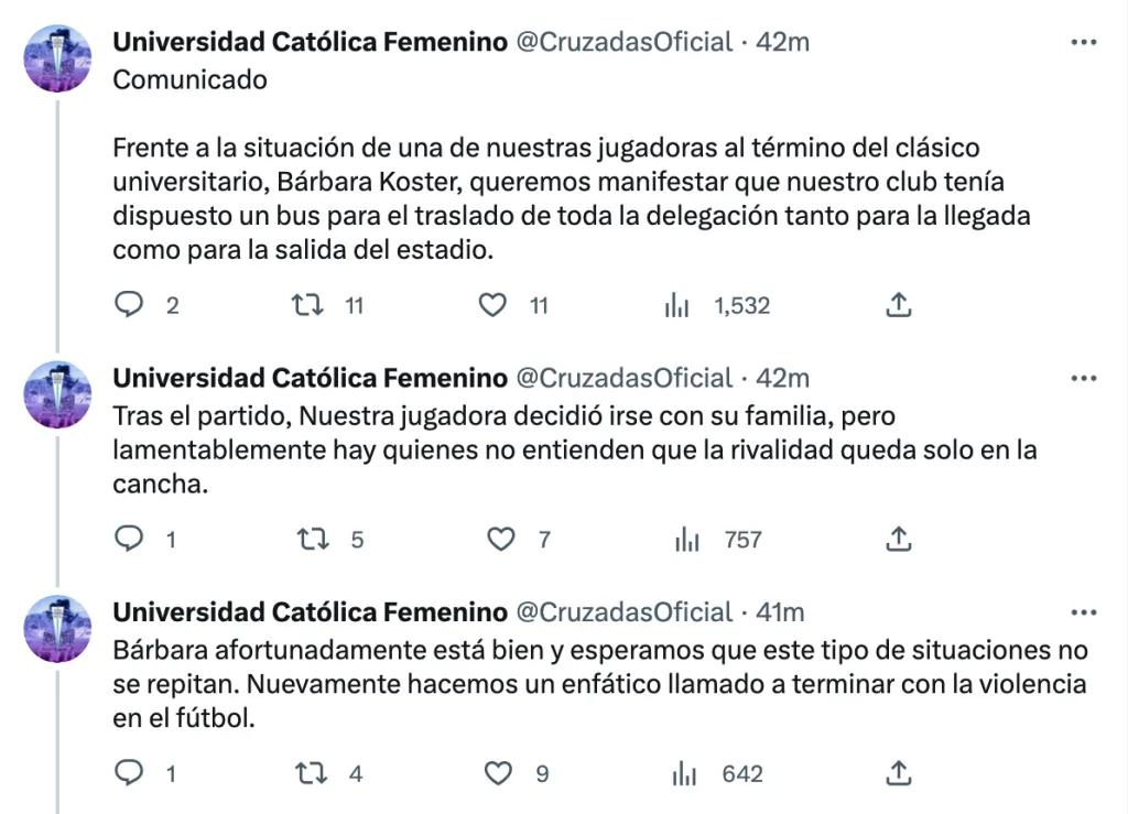 “Tras el partido, nuestra jugadora decidió irse con su familia, pero lamentablemente hay quienes no entienden que la rivalidad queda solo en la cancha”, agregó la UC.